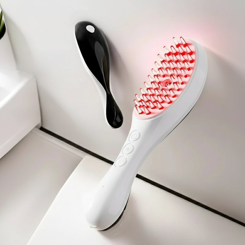 Ce peigne combine vibrations relaxantes et technologie lumineuse rouge & bleue pour stimuler le cuir chevelu, apaiser les tensions et améliorer la santé capillaire.